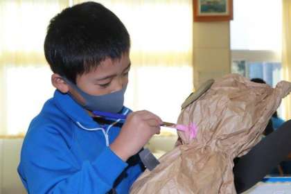 形を整えた後、絵の具で顔や模様を描きこんだり、画用紙を貼って飾りをつけたりしていました。それぞれに工夫して素敵な作品が出来上がりました。