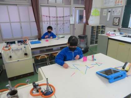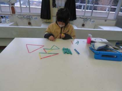 一人一人が色棒を使って、さまざまな形の三角形をつくっていました。