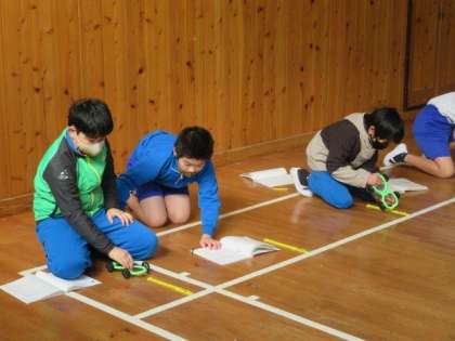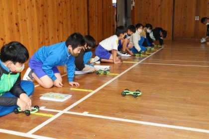 「ゴムと風の力」についての学習をしています。今日は、ゴムの力で走る車を使って、ゴムの伸ばし方を変えると、車の進む距離はどのように変わるのかを確かめる実験をしました。みんな、車の動きを楽しみながら、しっかりと測定ができました。次回の授業で、実験結果からわかったことについて話し合う予定です。