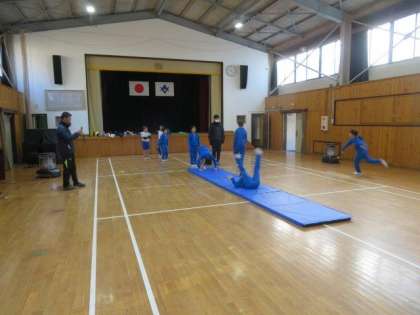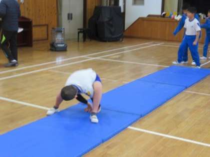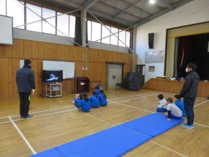 マット運動の学習をしていました。初めに、見本の動画を見て、正しい形をイメージし、実際に技に挑戦しました。その後、撮影した自分たちの動きを見ながら、気を付けると良い点を確認していました。ICT機器を活用して運動の技能を高めていました。