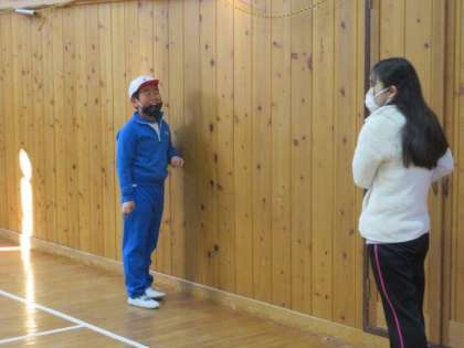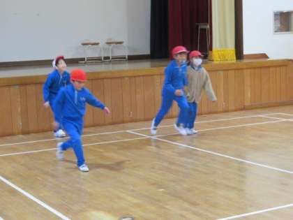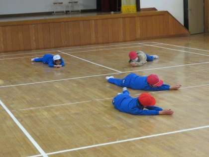 1/20 1・2年生 公開日 2023/01/20 更新日 2023/01/20 各学年から 1・2年生 体育科の授業の様子です。 集会室で「ひょうげんあそび」をしていました。今回は「だるまさんがころんだ」をアレンジした活動に取り組みました。今日は、だるまさんではなく、ライオンやヘビなど、さまざまな動物になりきってその様子を表現していました。2枚目の写真は、「へびがころんだ」様子です。寒さに負けず、元気に体を動かしていました。