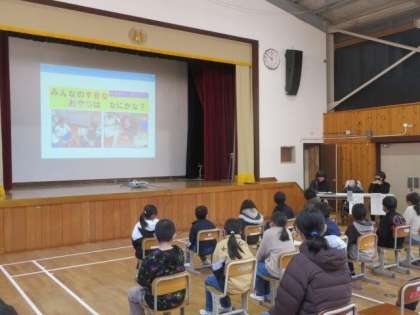 「好きなおやつ調べ」についての発表を行いました。全校児童にインタビューをしたり、その結果をまとめたりした活動について、先生と一緒に堂々と発表することができました。これからも、さまざまな人と関わる活動に積極的に取り組んでいってほしいです。
