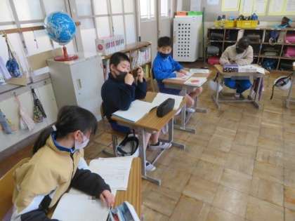 「言葉でつたえ合う」の学習です。相手にわかりやすく伝えるための言葉の選び方や説明の仕方について学びました。例文を参考にして、それぞれがすきな食べ物について紹介する文章を書きました。工夫してよい文章が書けており、読んでいるとお腹がすいてきてしまいました。