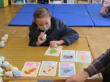 2/14 ひまわり学級 公開日 2023/02/14 更新日 2023/02/14 各学年から ひまわり学級 国語科の授業の様子です。 今日も「カタカナ」の学習をしていました。カタカナカードを見て「食べられる物」を選び取ったり、「好きな食べ物」を選んだりしました。先生と対話しながら、たくさんの言葉を覚え、自分の思いや考えを表現できるようになってきました。