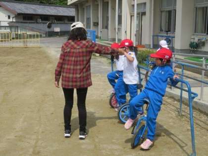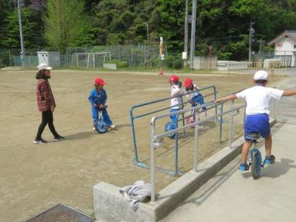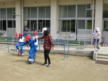 4/19 1・2年生 公開日 2023/04/19 更新日 2023/04/19 各学年から 1・2年生 体育科の授業の様子です。 5月の運動会に向けて、一輪車の練習をがんばっています。毎日放課にも練習に取り組んでいるので、1年生も少しずつバランスがとれるようになってきました。きっともうすぐ、すいと乗れるようになると思います。これからの上達が楽しみです。