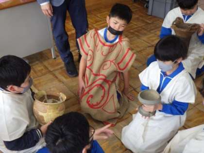 4/19 5・6年生 公開日 2023/04/19 更新日 2023/04/19 各学年から 5・6年生 社会科の授業の様子です。 文化財課より講師の先生にご来校いただきました。縄文時代と弥生時代の特徴について、土器や衣服などの資料をもとに考えることができました。発見したことや疑問に感じたことを伝え合いながら、理解を深めることができました。これからも興味・関心をもったことをどんどん調べていきましょう。