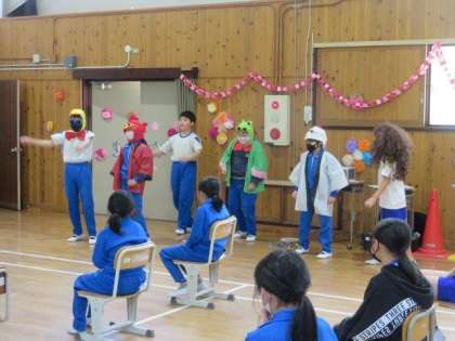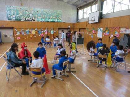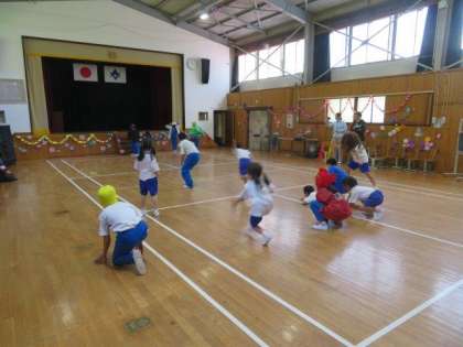 はじめに「だるまさんがころんだ」をしました。全校のみんなで、集会室いっぱいに広がって楽しく体を動かすことができました。