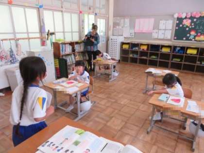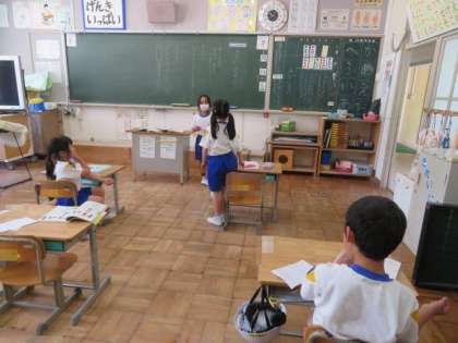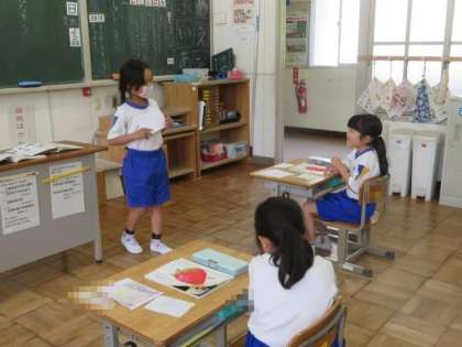 5/12 1年生 公開日 2023/05/12 更新日 2023/05/12 各学年から 1年生 国語科の授業の様子です。 「みんなに はなそう」の学習です。順番に友達にクイズを出し合いました。問題には、先日、図画工作科の授業で描いた春の花や生き物の絵を使いました。それぞれ、自分が見つけたものを友達に伝え、聞き手はそれが何かを考えて答えていました。対話的な学びを通して、伝え合う力が高まっていく様子が見られました。