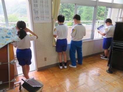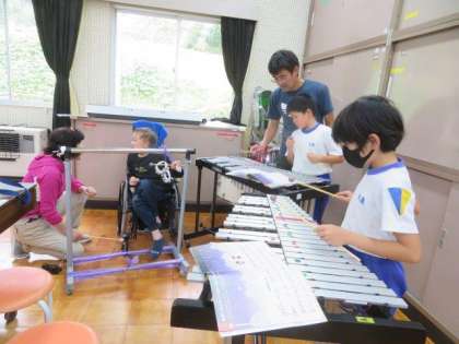 5/19 5・6年生 ひまわり学級 公開日 2023/05/19 更新日 2023/05/19 各学年から 5・6年生 ひまわり学級 音楽科の授業の様子です。 「星空はいつも」の歌唱と合奏の学習です。演奏する子と歌う子に分かれて、練習をしていました。歌唱は学習用タブレットも活用しながら、きれいな声で歌っていました。演奏は、楽譜をよく見て、リズムよく叩けるように練習していました。曲の雰囲気を感じながら、楽しそうに取り組んでいました。