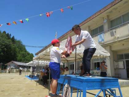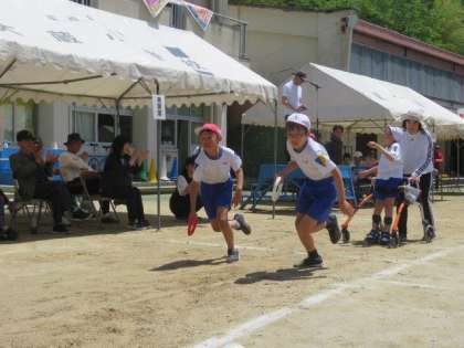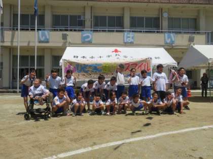 最後は「赤白リレー」「閉会式」そして全校集合写真です。最後まで、赤白対抗も大いに盛り上がりました。昨日の大雨で、実施が危ぶまれましたが、朝早くから地域のみなさまにご協力いただきグラウンド整備を行えたことで、とてもよい運動会となりました。保護者のみなさまからも早朝よりたくさんの応援をいただくことができ、子どもたちの大きな力となりました。