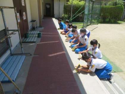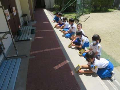 「太陽の光」の学習です。鏡を使って日光をはね返し、光の進み方について調べました。みんな、壁に貼った的をめがけて夢中で光をはね返していました。実験を通して、光がまっすぐに進むことや、たくさんの光を当てると温度が高くなることなどを理解できました。これからも、実験や観察を通して、いろいろなことを学んでいきましょう。
