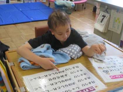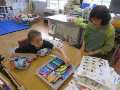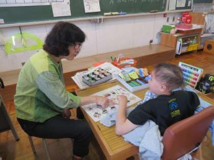 6/7 ひまわり学級 公開日 2023/06/07 更新日 2023/06/07 各学年から ひまわり学級 対話トレーニングの様子です。 朝の会が終わると、進んで予定表を取り出して「対話トレーニング」に取り組んでいました。昨日の出来事について、先生からの問いかけに対して「支援ボード」のイラストを指し示して説明できました。その後は、自分から「言葉カード」を取り出して、誰と、何をしたかについて詳しく伝えることができました。対話スキルとともに、対話への意欲も格段に高まっている様子が見られました。