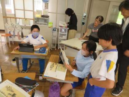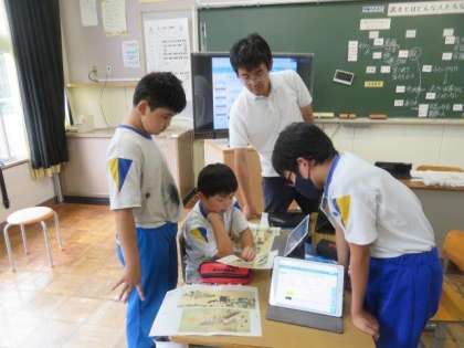 今日は「武士の役割と立場」について話し合いました。提示された資料(絵巻)をもとに、当時の武士の様子や、貴族との違いなどの「問い」について、学習用タブレットを活用しながら話し合いました。「対話」を通して、考えが焦点化され、深まり、武士の役割としては「人を守る」ということが明らかになりました。「振り返り」では、友達の意見のよさや、これから知りたいことなどが出されました。「問い」「対話」「振り返り」のサイクルを意識した授業の成果がだんだんと表れてきていることが感じられる1時間でした。