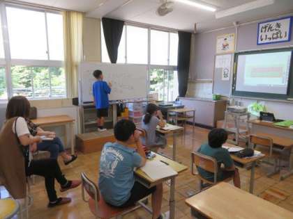 6/17 学校公開日4 公開日 2023/06/17 更新日 2023/06/17 各学年から 5・6年生 算数科の授業の様子です。5年生は「小数」の学習です。整数のときと同じように、計算のきまりを使って問題を解く方法をみんなで話し合いました。6年生は、「分数の割り算」の学習です。さまざまな問題を解くための手順を一つ一つ確認しながら解いていました。自分の考えを友達に伝えながら、対話を通して考えを深めていく様子が見られた授業でした。