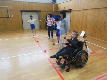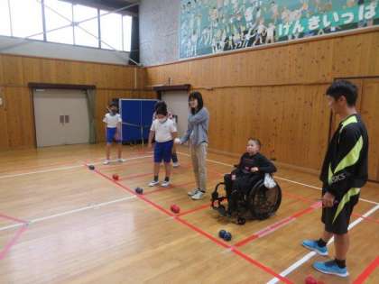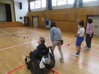 6/22 6年生 ひまわり学級 公開日 2023/06/22 更新日 2023/06/22 特色ある学校づくり推進事業 6年生 ひまわり学級 合同体育科の授業の様子です。 今日は、みんなで「ボッチャ」をしました。体力向上補助指導員の方にも加わっていただき、「6年生チーム」対「先生チーム」でボッチャ対決をしました。6年生チームが後半調子を上げてきて、最後は逆転で勝利しました。6年生も先生たちも、笑顔いっぱい、元気いっぱいで楽しい時間を過ごせました。