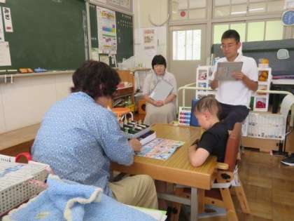 国語科の授業を行いました。今日も、カタカナの学習をしたり「言葉カード」を使って、これまでの出来事や今後の予定を伝えたりしました。大勢の先生方が参観する中で、はりきって学習する様子が見られました。今後も、さまざまな方法でたくさんの思いや考えを発信していってほしいです。