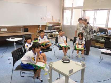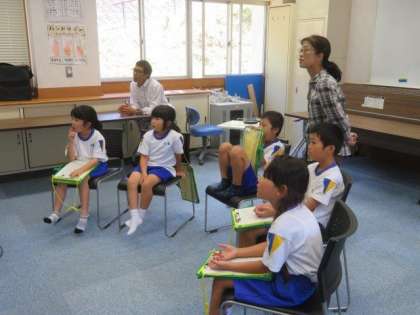 続いて、1・2年生の様子です。生活科「校歌じまんをしよう」の学習です。それぞれの学校の校歌を紹介し、合わせて各校の特色や自慢できる取組などを伝え合いました。事前に準備を整えておいたため、各校ともにしっかりと発表ができました。お互いの学校のことを知るよい機会となりました。