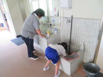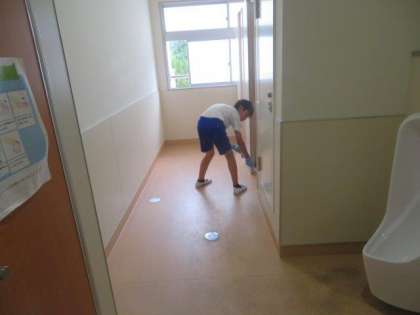 4月から使ってきた教室に、感謝の気持ちを込めて全校で大掃除をしました。普段は掃除しきれない細かいところまで、丁寧に掃除しました。蒸し暑い中でしたが、みんな一生懸命取り組みました。