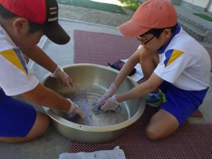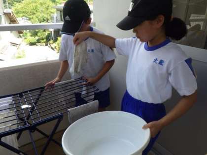 7/19 5・6年生 公開日 2023/07/19 更新日 2023/07/19 各学年から 5・6年生 家庭科の授業の様子です。 今日は、「洗濯」の実習をしました。雑巾を手でしっかりと洗いました。普段はお家の方が洗濯機で洗ってくださるご家庭がほとんどかと思います。子どもたちにとって、貴重な体験でした。汚れの落とし方や干すときの注意点をしっかりと覚えておき、これからの生活に生かしていきましょう。