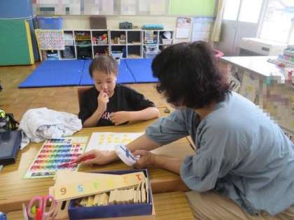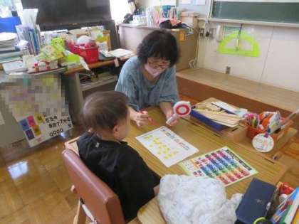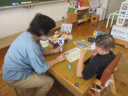 今日も、言葉の学習をしました。絵を見て、どのような動作をしているか説明する文を、ひらがなのシールを貼って完成させました。「ほる」「なげる」など、さまざまな表現を覚えて、正しく使えるようになってきています。