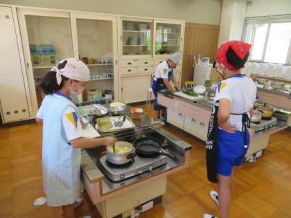 9/25 5・6年生 公開日 2023/09/25 更新日 2023/09/25 各学年から 5・6年生 家庭科の授業の様子です。 今日は調理実習を行いました。ご飯を炊いて、みそ汁をつくり、野菜を使っておかずもつくりました。みんなで協力して、立派な昼食が完成しました。みんなでつくった食事の味は格別のようでした。自分で食事をつくることができる、というのはとても大切なことです。今日学習したことを忘れないよう、ぜひお家でも食事をつくってみてほしいと思います。
