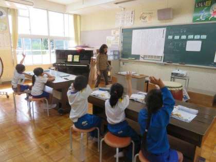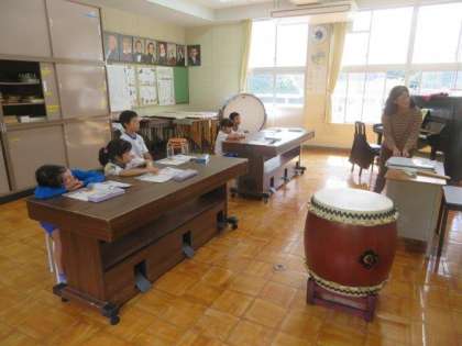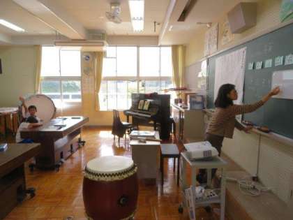 今日は「おまつりの音楽」の学習です。お祭りの音楽にふさわしいリズムを、みんなで考えました。繰り返しも使いながら、みんなで楽しく考えることができました。リズムを考えながら、「四分音符」や「四分休符」などの記号についても学習しました。しっかりと覚えて、これからの学習に生かしていきましょう。