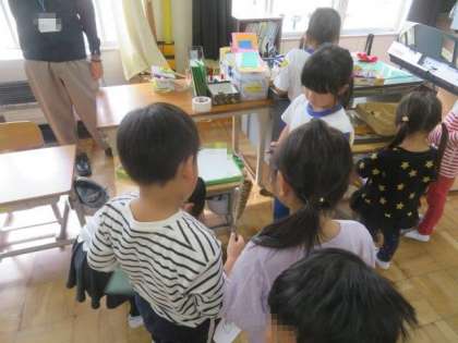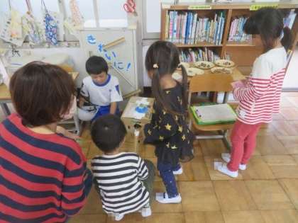 今日は、こども園児や園の先生方をお招きして「あきのあそびランド」を開催しました。集めた木の実などを使って作った駒や迷路で楽しく遊べるよう、1・2年生みんなで工夫しました。園児にわかりやすい説明を考えたり、ルールを工夫したりしながら準備を進めてきました。がんばってきた甲斐あって、園児もとても楽しんでいました。1・2年生にとっても、園児にとってもよい時間となりました。