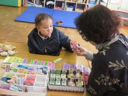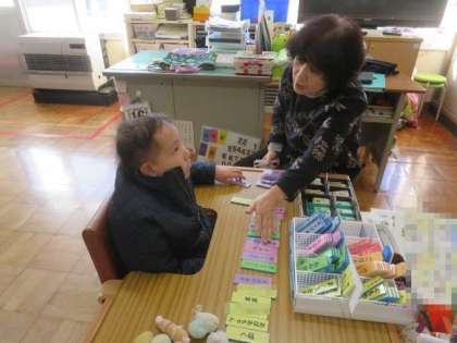 11/16 ひまわり学級 公開日 2023/11/16 更新日 2023/11/16 各学年から ひまわり学級 対話トレーニングの様子です。 今日も「言葉カード」を使ってたくさんお話をしました。今月の予定について、誰と、どこへ行き、何をするかなど、詳しく先生に伝えることができました。述語の使い方がとても上手になり、何をするのかをわかりやすく伝えることができるようになりました。