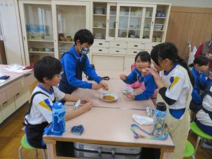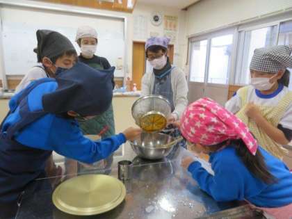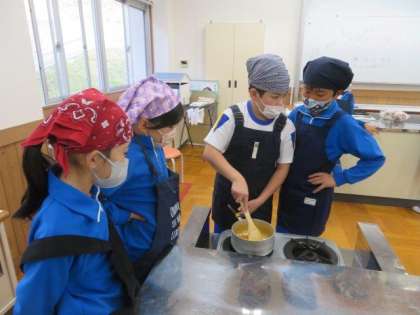 今日は、以前収穫したヤマボウシの実を使って、ジャムをつくりました。地域講師の方にご来校いただき、作り方を教えていただきながら、みんなで一生懸命つくりました。クラッカーにつけて食べると、とても美味しくて、みんな大喜びでした。大蔵小学校が伝統的に取り組んでいるヤマボウシを通した学習を、今後も大切にしていきたいです。