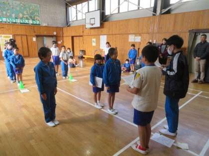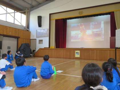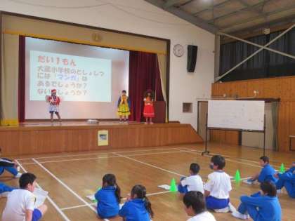 ぬくもり集会の様子です。今日は、のびのびタイムを使って、ぬくもり委員会の子たちが集会を開いてくれました。全校のみんなが本に親しむことができるように、夏休み前から準備を進めてきました。初めに、たくさんの本を読んだ子に読書賞の表彰を行いました。続いて、映像によるシリーズ本の紹介がありました。映像の中に夏休み前に転出した友達が登場し、大いに盛り上がりました。その後は、大蔵小学校の図書室に関するクイズを交えた劇を演じてくれました。