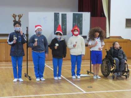2023年最後の元気サミットを行いました。初めに、各グループごとにめあての振り返りを行いました。その後、委員会からの連絡、誕生日紹介と続きました。今回の誕生日紹介は、クリスマスが近いこともあり、5・6年生によるハンドベルの演奏という素敵な内容でした。最後に、書道コンクールに応募した作品の表彰伝達を校長先生にしていただきました。冬休み前に、全校でしっかりとめあての確認などができました。