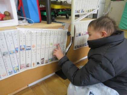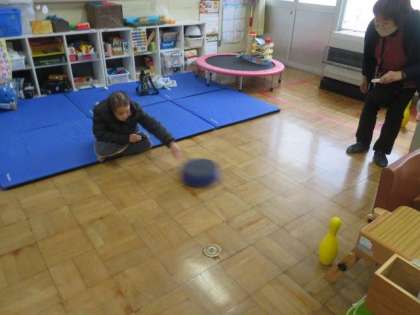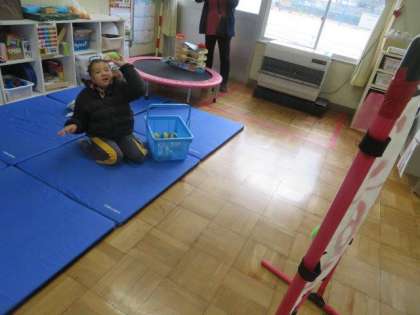 今日は「筋力をつける運動」に取り組みました。初めに、ボール投げをしました。的に向かって、何度も力強くボールを投げることができるようになりました。その後は、ボーリングのピンをめがけてボールなどを転がして倒す運動、ハードルをまたぎ越す運動、お相撲などをしました。集中してしっかりと身体を動かすことができました。終了後は、学習に使う宝物について掲示物を使って教えてくれました。身体を鍛えながら、しっかりと対話をすることもできた1時間でした。