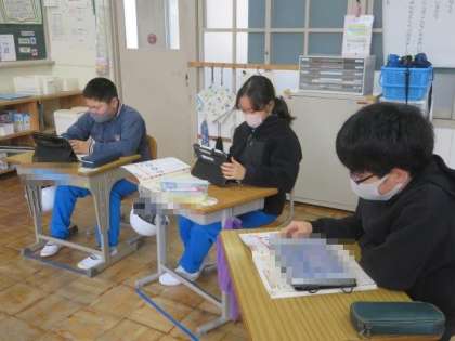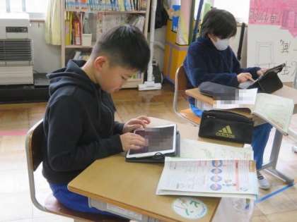 今日は「冬を明るく温かく」の学習です。冬を快適に過ごすために、どのような工夫をしているか、衣食住ごとに考えました。学習用タブレットを活用して、考えをまとめてから、みんなで対話をしました。まだまだ寒い日が続きます。冬を気持ちよく過ごすためにできることを、みんなで考えて実践していきましょう。