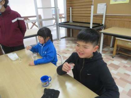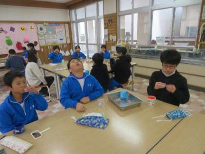 1/11 フッ化物洗口 公開日 2024/01/11 更新日 2024/01/11 特別活動 フッ化物洗口の様子です。 今日から、歯磨き後のフッ化物洗口を再開しました。コロナ禍の最中は中止していましたが、校内の状況を見ながら、虫歯予防効果を期待し、再開することになりました。初めて行う子も多く、においをかいだり、不思議そうに液を眺めたりする姿が見られました。初日の洗口は無事に終えることができました。これから毎週木曜日に行う予定です。