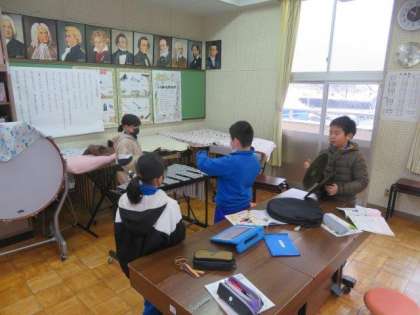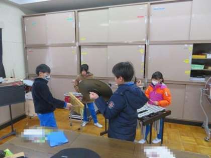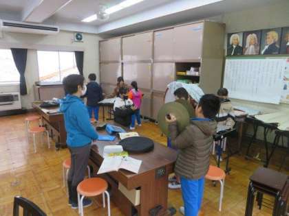 1/24 3・4年生 公開日 2024/01/24 更新日 2024/01/24 各学年から 3・4年生 音楽科の授業の様子です。 今日は「おかしの好きな魔法使い」の学習です。魔法をかけるときの音楽や、お話をつなぐセリフなどをグループに分かれて考えました。たくさんの楽器を使って、素敵な魔法の音楽を考えることができました。みんなで協力して楽しく学習できました。