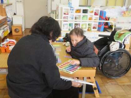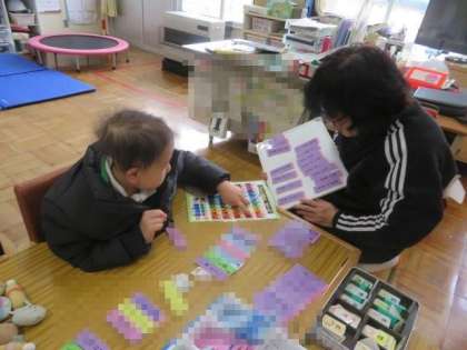 今日も、たくさんの言葉カードと五十音表を使って、先生と対話していました。述語カードの種類も増え、その中から適切なカードを選べるようになっているため、より詳しく内容を伝えることができるようになりました。毎日、先生に伝えたいことがたくさんあるようで、コミュニケーションの意欲と技能の高まりを感じます。