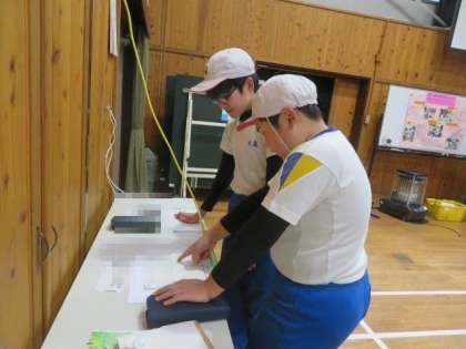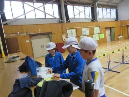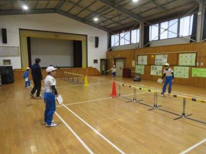 今日はネット型の種目「テニピン」をしました。厚紙でつくったラケットを手にはめて、やわらかいボールを打ち返すスポーツです。学年ごとに分かれて、作戦を考えながらラリーを続けることができました。繰り返し取り組むことで、力加減やコツがつかめてきたようで、ボールを打つ技能が高まってきています。この調子でがんばっていきましょう。