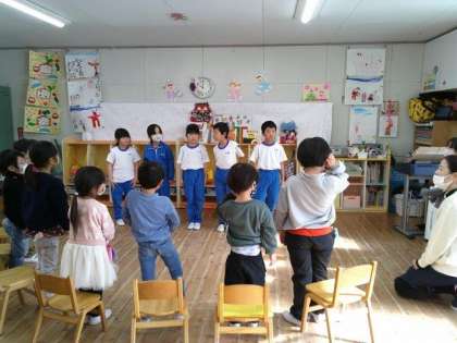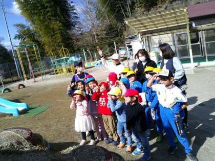 2/6 1・2年生 公開日 2024/02/06 更新日 2024/02/06 各学年から 1・2年生 大蔵こども園との交流の様子です。 今日は、大蔵こども園のお友達と交流をしました。「あきのおもちゃランド」では、小学校へ来てもらいましたが、今日は園に出かけていきました。一緒にトランプや砂場遊びなどをして楽しく過ごすことができました。感染対策などに留意しながら、今後も、園と連携した活動を継続していけるとよいと思います。