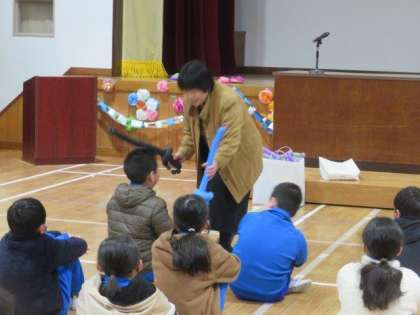 3/4 全校朝会2 公開日 2024/03/04 更新日 2024/03/04 特別活動 表彰の次は、教頭先生のお話を聞きました。 まずは、地域の方からいただいた、バルーンアート作品の紹介です。剣やさまざまな動物など、楽しい作品がいっぱいでした。その後は、教頭先生のおすすめの絵本を3冊紹介していただきました。素敵な本との出会いは、人生を豊かにしてくれます。子どもたちが、これからもたくさんのよい本と出会っていけるとよいと思います。