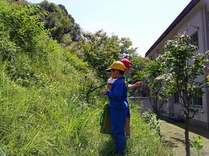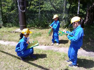 『春さがしビンゴ』を行いました。ビンゴカードのマスは9こ。用意された自然物のカード(アリ、白い花 など)から、学校内にありそうなものを一人一人が9枚選び、貼り付けてビンゴカードを作りました。活動を通して、草笛を鳴らせるようになった子が何人もいました。草相撲も楽しみました。