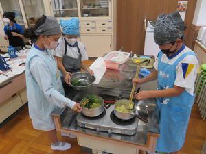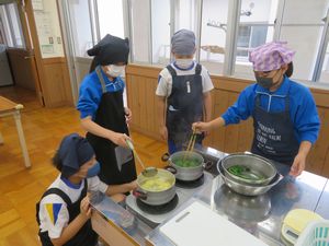 5/31 5・6年 家庭科 公開日 2024/05/31 更新日 2024/05/31 お知らせ ゆでる料理の調理実習を行いました。メニューは「ゆでいも」と「ほうれん草のおひたし」です。ジャガイモの皮をピーラーでむき、包丁で適当な大きさに切って茹でました。ほうれん草は、茹でてから切りました。どちらもおいしくできあがりました。