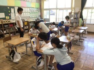 高学年の朝の活動の様子 5年生は、来週のキャンプに向け、自分たちでしおりの内容を確認していました。