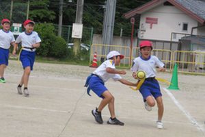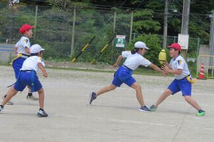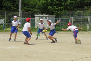 中学年・高学年ともに体育で「タグラグビー」に取り組んでいます。今日は合同で、3色グループに分かれてゲームを行いました。パスをつないだりトライを決めたりして、試合らしくなってきました。試合をしていないグループは作戦タイムです。どのグループも、得点するために【ヒントカード】を参考に作戦を練ったり、練習したりしました。