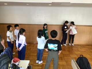 キャンプファイヤーのスタンツ練習 二つの班で協力してスタンツを行います。