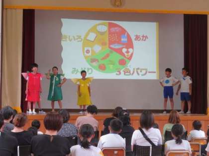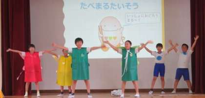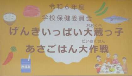 6/27 学校保健委員会 1 公開日 2024/06/27 更新日 2024/06/27 学校行事 『げんきいっぱい大蔵っ子 あさごはん大作戦』をテーマに、学校保健委員会を開催しました。はじめに、児童すこやか委員会による発表がありました。3色パワーを意識した朝食をとることの大切さを、劇を通してみんなに伝えました。