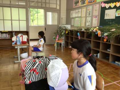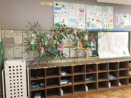 もうすぐ七夕 低学年の教室には七夕飾りがあります。 願い事が叶うとよいです。