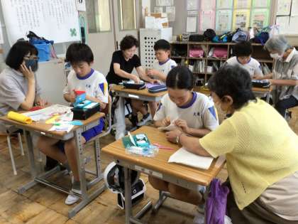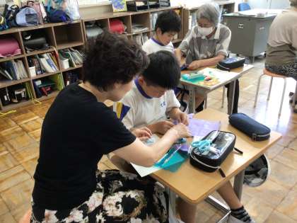 家庭科の裁縫で、地域ボランティアの方々に手伝っていただき、子どもたち一人一人に手厚いサポートができました。