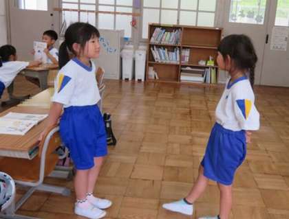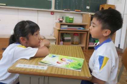 絵日記を書くために、今日の出来事を友だちと伝えあいました。