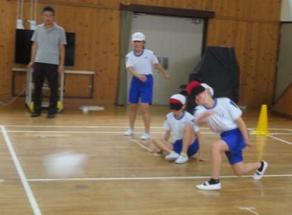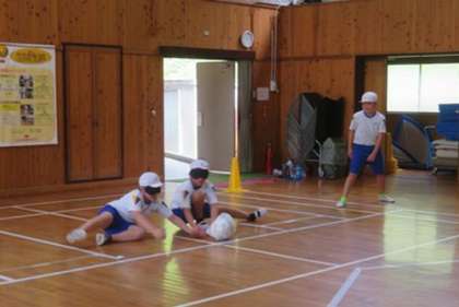 7/18 高学年 体育科『ゴールボール』 公開日 2024/07/18 更新日 2024/07/18 各学年から パリのパラリンピックで実施される『ゴールボール』。鈴の入ったバスケットボール大のボールを互いに投げ合い、得点を競うチームスポーツです。選手は障がいの程度に関わらず、目隠しをして全盲状態でプレーします。 今日の授業は、1チーム2人で対戦しました。子どもたちもアイマスクをし、ボールにはビニール袋を被せ、カサカサ音を鈴の代わりにプレーしました。