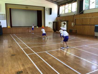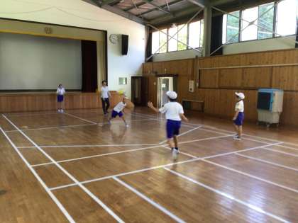 中学年の体育 熱中症警戒アラート発令中のため、集会室でドッジボールをしました。
